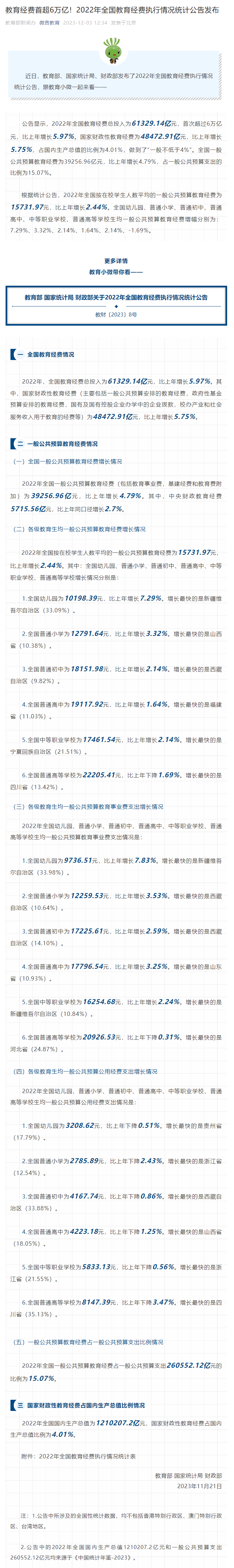 教育经费首超6万亿!2022年全国教育经费执行情况统计公告发布